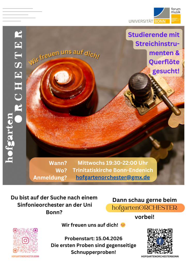 Das Hofgartenorchester ist ein studentisches Sinfonieorchester an der Universität Bonn. Jedes Semester studieren wir gemeinsam mit unserem Dirigenten ein neues Programm ein und präsentieren es in mehreren Konzerten.